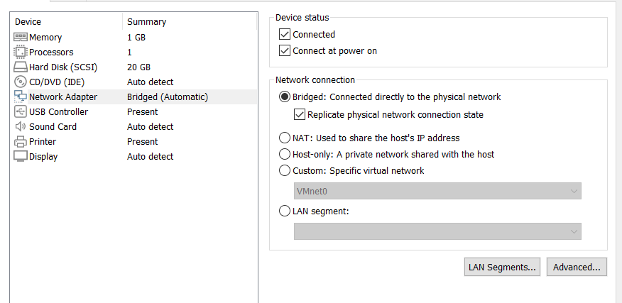 2. 좌측 Network Adapter 클릭 후 Network connection에서 Bridged 클릭